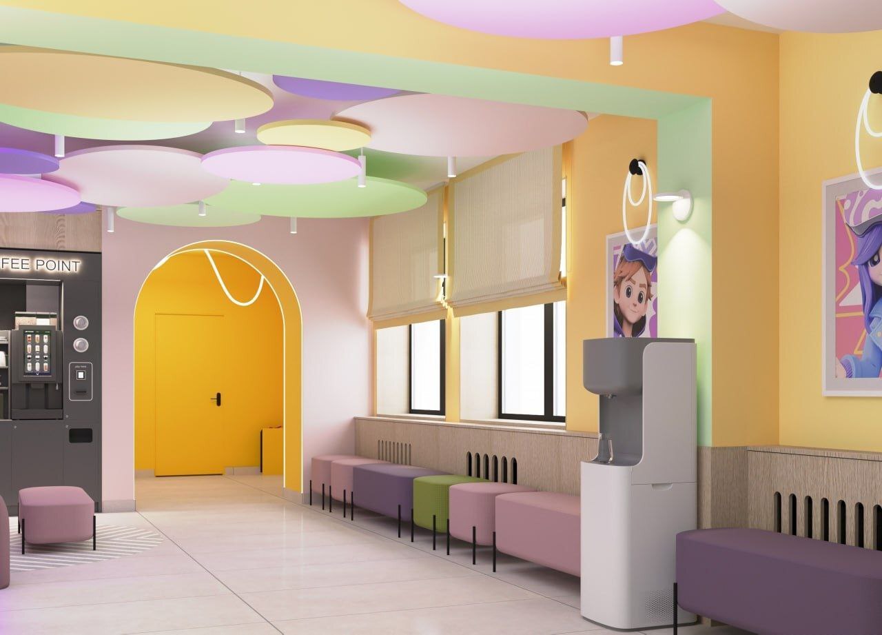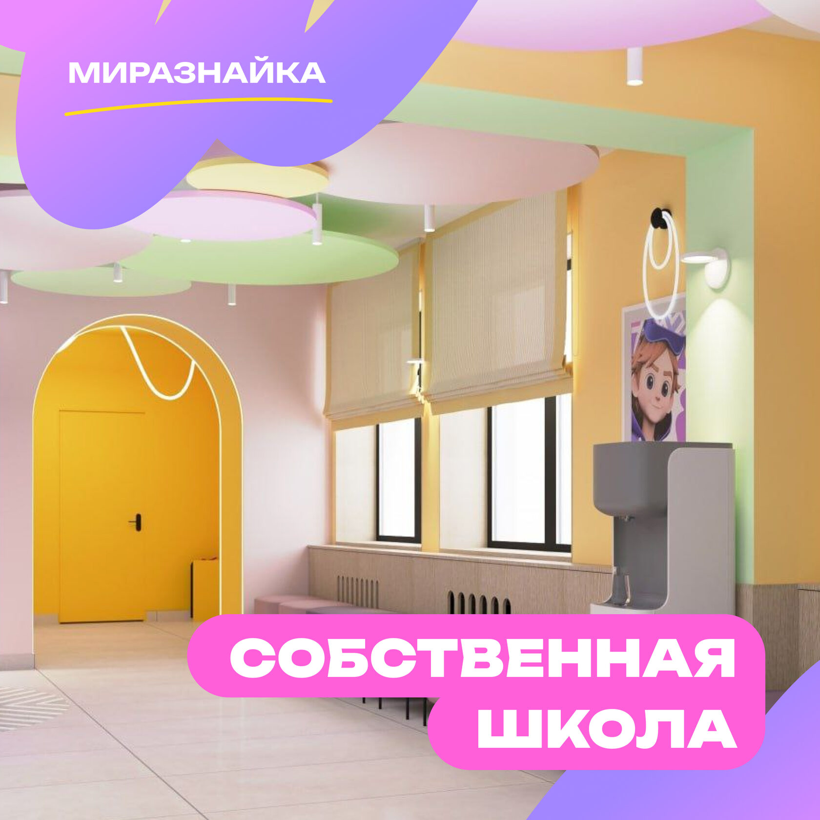 Пространство школы полностью отражает концепцию бренда «Миразнайки»: фирменный стиль, современные классы для занятий, продуманная инфраструктура для детей и родителей. Посмотрите дизайн-проект и оцените, какой будет школа изнутри!